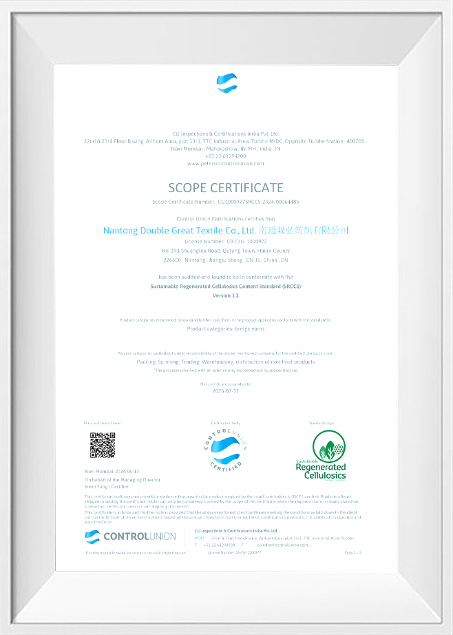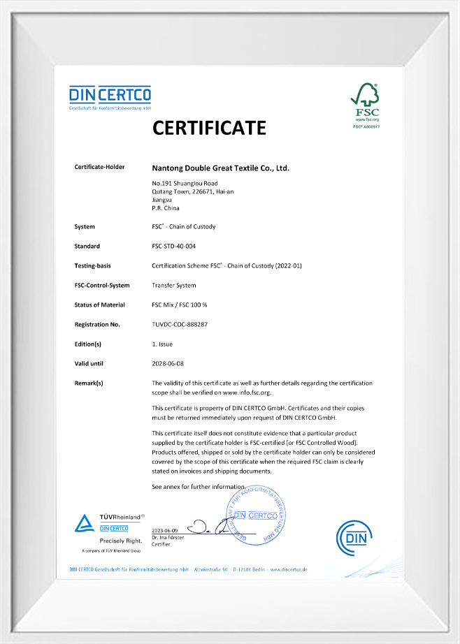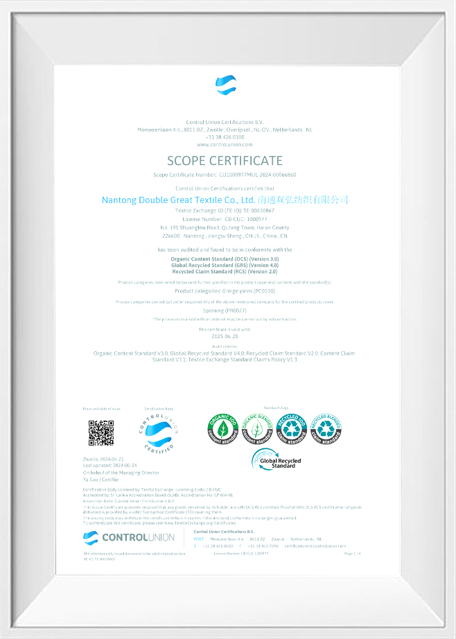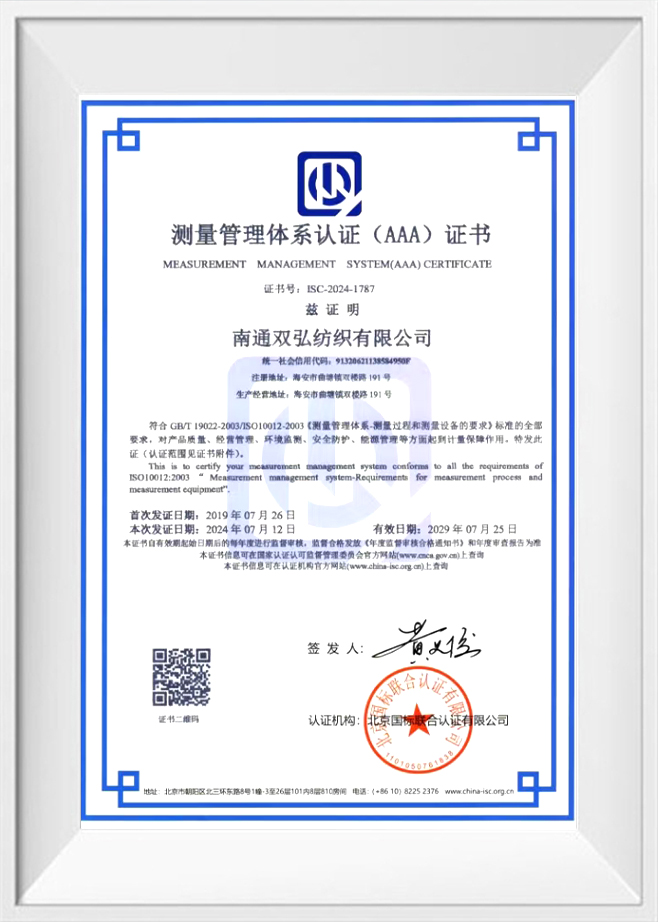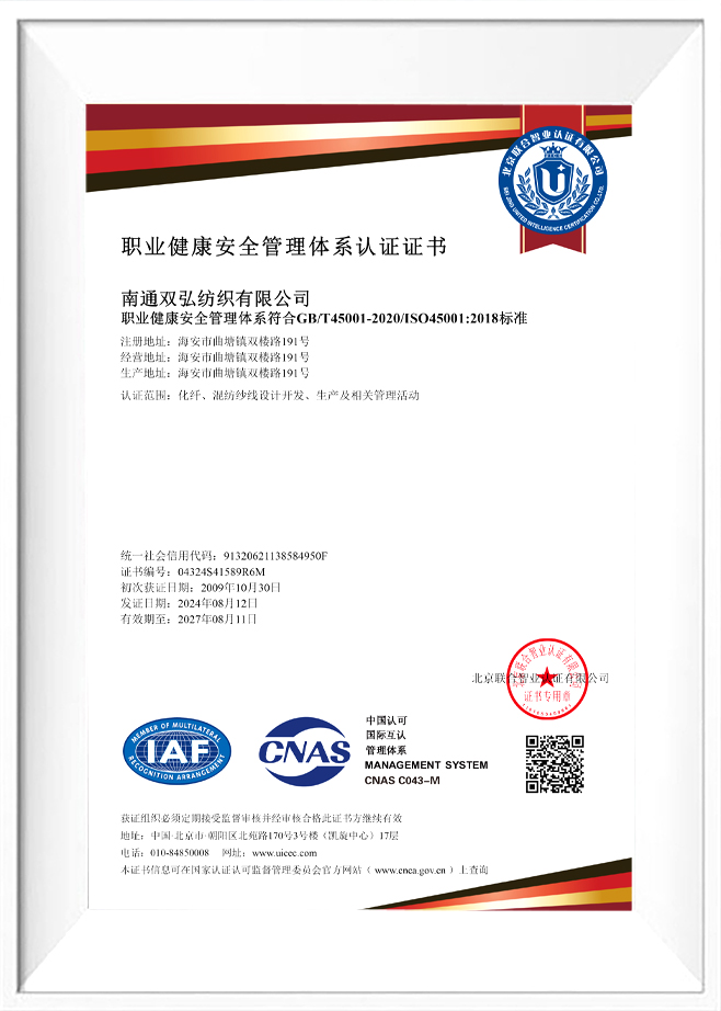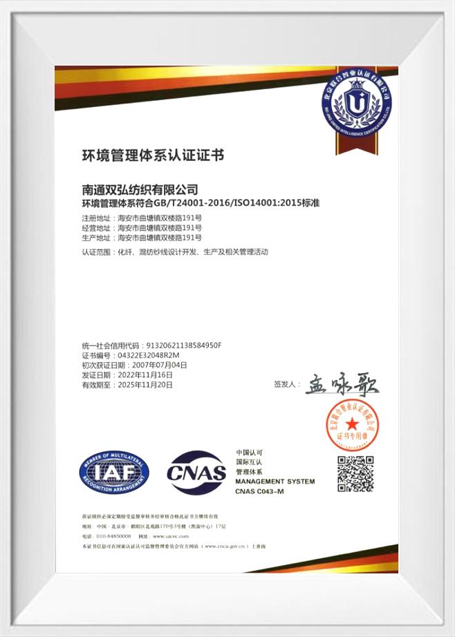 Kualitas dan perlindungan lingkungan adalah komitmen kami kepada pelanggan kami. Untuk tujuan ini, kami telah memperoleh sejumlah sertifikasi otoritatif untuk memastikan kualitas dan perlindungan lingkungan dari setiap batch produk. Benang ramah lingkungan kami telah melewati pengujian dan sertifikasi yang ketat, termasuk sistem manajemen lingkungan ISO 14001, pengujian profesional dan sertifikasi benang antibakteri dan antistatik, dll. Ini tidak hanya memverifikasi kemampuan inovasi kami, tetapi juga mencerminkan komitmen kami untuk manufaktur ramah lingkungan yang standar tinggi.