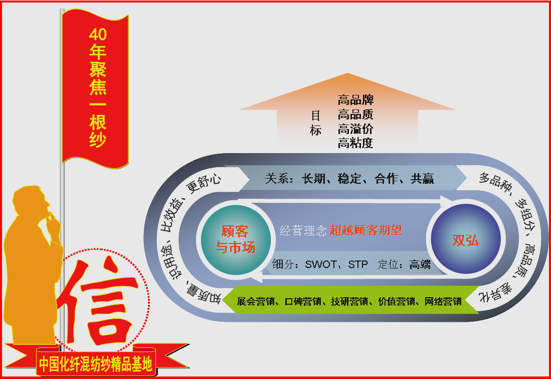 Berfokus pada pelanggan dan peningkatan merek adalah persyaratan yang tegas dan pengejaran perusahaan Ji Yijun dalam pekerjaannya. Under his advocacy, the company has formulated the business philosophy of "using the rigorous management, spinning the quality yarn, and climbing the -end customers", with "high brand, high quality, high premium, and high stickiness" as the goal, using "SWOT, STP" and other tools to investigate and segment the market, lock in key customer groups, adopt a "small batch, multiple varieties, fast delivery, high quality" fast marketing strategy, implement "exhibition marketing, Pemasaran dari mulut ke mulut, pemasaran riset teknis, pemasaran pengetahuan, pemasaran nilai, pemasaran jaringan "dan metode lainnya, dan menggunakan" 30 artikel pedoman layanan hebat ganda "untuk membuat pelanggan" mengetahui kualitas, mengenali tujuan, membandingkan manfaat, pengiriman cepat, dan lebih nyaman ", membangun" pelanggan jangka panjang, kooperatif, dan pelawak yang lebih baik dari pelanggan, dan meraih lomba, dan merawat pelanggan, dan meraih lomba, dan merawat pelanggan, dan meraih lomba, dan meraih model pelanggan yang sangat kompetitif, dan memelihara lomba, dan meraih lomba, dan merawat, dan membentuk model pelanggan yang sangat kompetitif, dan memelihara lomba, dan merawat, dan membentuk model pemasaran yang sangat kompetitif.