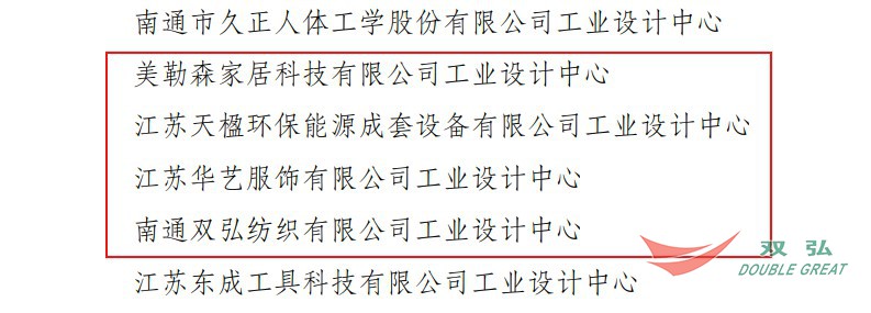 Baru -baru ini, dipelajari dari Departemen Industri dan Teknologi Informasi Provinsi Jiangsu bahwa Pusat Desain Industri Nantong Double Great Textile Co., Ltd. dianugerahi Judul Pusat Desain Industri Jiangsu pada tahun 2022 .