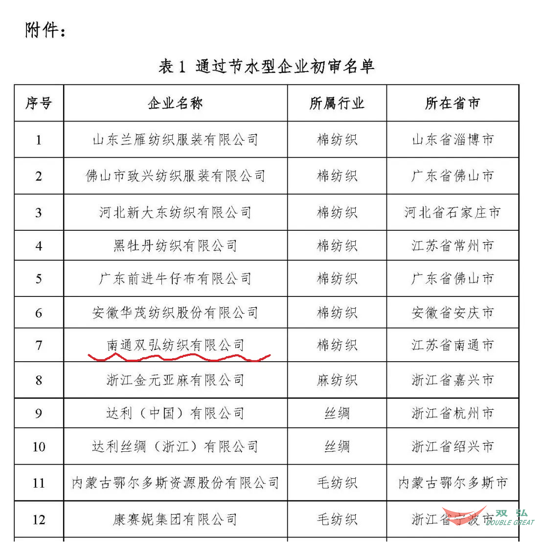 Dalam beberapa tahun terakhir, Nantong Double Great telah mematuhi posisi pengembangan industri baru "Teknologi, Hijau, dan Mode", dengan cermat mengikuti persyaratan baru industri untuk konservasi air, dan mendaur ulang semua penggunaan air utama perusahaan, seperti pengendalian suhu dan kelembaban dalam lokakarya produksi dan air untuk pendinginan unit kompresor udara, untuk mencapai konservasi air. Dalam hal pengelolaan konsumsi air yang efektif, pendukung pengukuran dan fasilitas keselamatan air digunakan untuk memastikan bahwa indeks konsumsi air yang baru per unit produk berada pada level dalam industri, dan untuk menjadi perusahaan benchmark untuk konservasi air dan peningkatan efisiensi dalam industri tekstil sesegera mungkin.